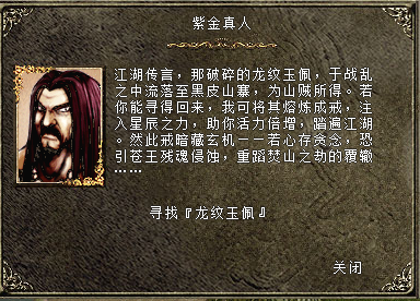 3. 打造戒指 -将「龙纹玉佩」交予紫金真人,锻造为龙纹戒胚。 4.开启戒指 -前往侠客村找到「戒指大师」,开启戒指任务。