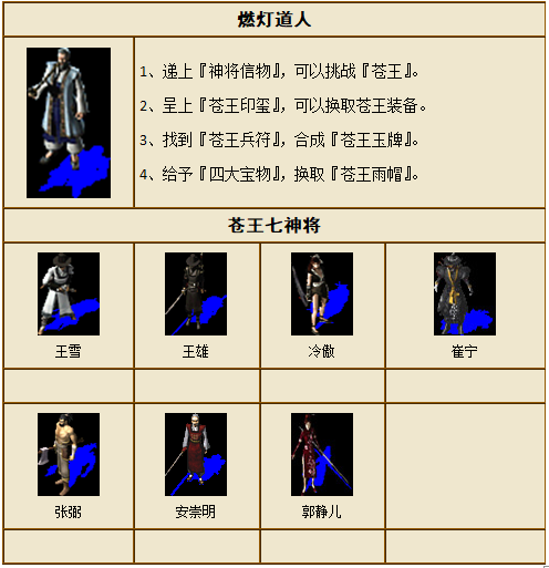 ——烬灯之谜:七将魂魄的归宿 在苍王焚山之战中,为了镇压九尾狐族的力量,苍王率领他的七位忠心耿耿的神将(阳刃王雄、阴刃王雪、冷判官冷傲、血魔手崔宁、赛愚公张弼、圣王剑安崇明、千手菩萨郭靖儿)与狐族展开了惨烈的战斗。虽然最终成功镇压了九尾狐族,但七神将在战斗中牺牲。苍王也在战后不久去世,他的追随者们为了纪念他并继续守护封印,建立了这座庞大的帝王陵墓。 苍王死后,七神将的魂魄被苍王封印在这座陵墓的第三层,继续守护着苍王的遗体和陵墓的秘密。随着岁月流逝,苍王时代的秘密逐渐浮出水面。你将深入这座神秘的王陵三层,探寻神秘王陵四大宝物,如果足够强大可以击败七神将的残魂,就能获取苍王系列护具和神将信物,并通过燃灯道人传送至苍王密室,追寻焚山的真相,杀死苍王的英灵就有几率获取苍王印玺,从而获得强大的苍王系列武器和衣服。此外,入侵三层忍王盗走了记载焚山真相的狐灵秘卷(上)卷,找到并杀死忍王,获取狐灵秘卷(上)卷。如果你可以集齐狐灵秘卷(上中下)三卷,把它交给王陵门口的雨中客,你就可以了解到焚山的真相和苍王的阴谋,顺便获取苍王战靴。 一、副本目标 1、击败入侵三层的东瀛忍王,寻找丢失的狐灵秘卷(上)卷。 2、寻找苍王控制七神将的残魂,试图解救他们。 3、寻找遗失的苍王兵符和王陵四大宝物。 4、在燃灯道人的帮助下,进入苍王密室,了解焚山真相。 二、任务奖励 1、狐灵秘卷(上)卷:用于了解焚山真相,王陵门口雨中客换取苍王战靴。 2、四大宝物:交予燃灯道人换取苍王雨帽。 3、苍王印玺:交予燃灯道人换取苍王系列武器。 4、兵符1-7:交予燃灯道人合成苍王玉牌。