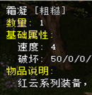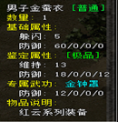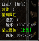 【这种粗糙、普通、精品和完美都是随机出现的,这是衣服的基础类等级】 2、除此以外,还会随机出现附加鉴定属性,分为:下品、中品、上品和极品,品系是依附在四大等级的基础之上。 (1)如果是衣服类,如: 【金蚕衣:使用金钟罩,全部属性累加算,不使用金钟罩,金钟罩附加的属性不算。】 (2)如果是武器类,除了附加鉴定属性外,可能会附加专属武功,如: 【右面有专属武功的日本刀,算法跟上面衣服算法一样。】 3、数值随机,没有固定! 4、关于速度和恢复的说明:如果显示如图: