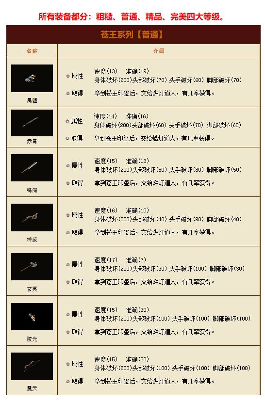 苍王系列是苍王为屠灭狐族、夺取蕴含星辰之力的龙纹玉佩,以黄龙脊骨为砧,剖开其千年凝结的龙血,取其魂魄精华,于万神坛前以血为墨、魂为引打造的终极神器。这一系列剑锋所指,血流成河;剑气所过,万物凋零,是“野心”与“毁灭”的极致体现。 禺疆、赤霄、鸣鸿、神威等共同构成了苍王系列的核心,这些武器不仅融合了黄龙之血与星辰之力,更以七神将的残骸为基,成为操控忠魂锁链的钥匙。传说焚山大战最后阶段,苍王以黄龙之血重塑七神将的残骸,打造出超越神将本体的武器,借此完成焚山之战的野心。这些神器既是苍王野心的延伸,也是江湖命运的转折点,唯有直面苍王陵第三层的“忠魂锁链”,方能窥见其真正的代价。