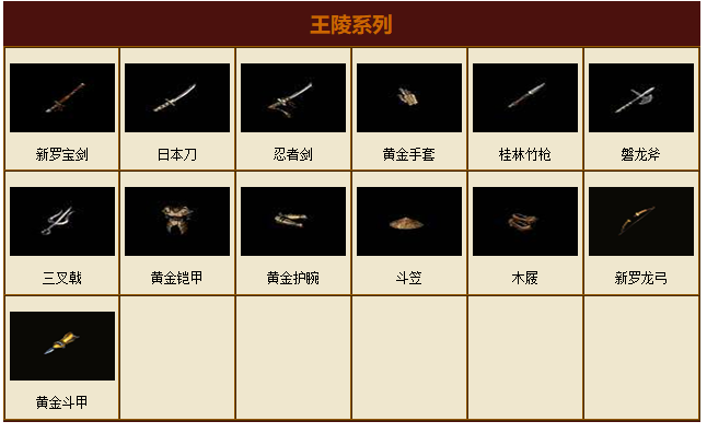 三、王陵系列 王陵系列的武器是七神将生前的神器,在焚山大战后被埋入苍王陵,作为陪葬之物永眠于地宫深处。这些神器随王者长眠而沉寂千年,唯有破解苍王陵机关者方可得之。 王陵系列蕴含苍王与七神将的英魂之力,剑出如雷霆,刀落似山崩,是“王权”与“宿命”的具现。这一系列的装备成为忠魂锁链的一部分,它们既是力量的象征,也是苍王野心与七神将忠魂的见证,唯有真正破解苍王陵机关的侠客,方能唤醒其沉睡的威能。