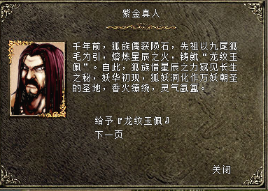 ——器以载道·龙纹之契一、故事背景 千年前,狐族以陨石为基,铸成神器「龙纹玉佩」,此物蕴含天地灵气,可助妖族突破修炼瓶颈。苍王觊觎其力,悍然发动焚山大战,血染九重天。战中「龙纹玉佩」被毁,失去星辰之力,最后落入黑皮山寨山贼之手。紫金真人为寻「龙纹玉佩」下落,隐居紫金仙境,如今将线索托付于你——唯有夺回「龙纹玉佩」、铸成戒指,方能窥见苍王野心与江湖真相。 二、任务流程 1. 获取「焚山古卷」 -在侠客村的紫金仙境找到「紫金真人」兑换「焚山古卷」,揭示龙纹玉佩的前世今生。
