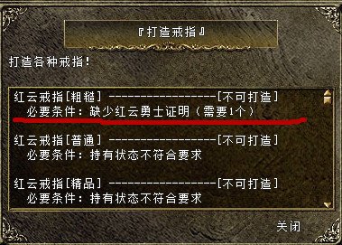 这里显示,升级红云戒指【粗糙】缺少的是【红云勇士证明】,那就需要去找到【红云勇士证明】,参考【怪物爆出表】。 「器以载道,由你定夺——你的选择,将改写武林的未来!」 |