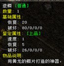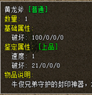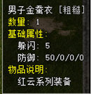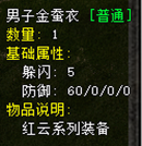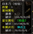 【这种粗糙、普通、精品和完美都是随机出现的,这是衣服的基础类等级】 2、除此以外,还会随机出现附加鉴定属性,分为:下品、中品、上品和极品,品系是依附在四大等级的基础之上。 (1)如果是衣服类,如: 【金蚕衣:使用金钟罩,全部属性累加算,不使用金钟罩,金钟罩附加的属性不算。】 (2)如果是武器类,除了附加鉴定属性外,可能会附加专属武功,如: 【右面有专属武功的日本刀,算法跟上面衣服算法一样。】 3、数值随机,没有固定! 4、关于速度和恢复的说明:如果显示如图: