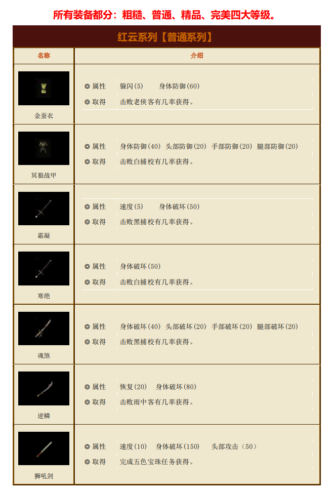 红云系列诞生于焚山之战前的和平年代,是人类与狐族共存时期的产物。其名源于“红云勇士”——那些在江湖中崭露头角的初阶侠客。九尾狐母曾以红云之力点化凡人,助其打造轻巧兵器,这些武器以轻便与实用性为主,适合初入江湖的侠客使用。虽品阶最低,但它们承载着人妖未分时的朴素信念,蕴含着江湖第一缕热血与信仰。 这些装备是侠客成长路上的第一步象征。这些武器装备虽不起眼,却因九尾狐母的点化而暗藏红云之力,成为人妖共融时代的最后回响。