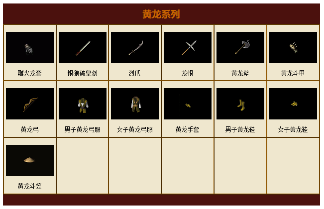 二、黄龙系列 黄龙系列起源于焚山大战后,七神将的神器被毁,后人根据残存的神器碎片与记载,以上古遗法复刻而成。这一系列借黄龙之名,融合七神将遗志与古老锻造技艺,剑锋所指处常伴随雷霆之势,是江湖中“忠义”与“复仇”的象征。这些以七神将遗物为蓝本的仿制品,虽不及真神器威力,却因承载七神将英魂而成为后人铭记焚山之战的寄托。 传说苍王陵中藏有七神将的真神器,而黄龙系列则是后人用残片与黄龙血脉之力重塑的“影子神器”。这些武器不仅是七神将忠魂的延续,更是江湖对焚山之战未竟之仇的无声呐喊。