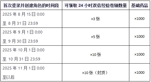 亲爱的侠士: 欢迎踏入《千年一·苍陵狐影》的浩瀚武林!为助各位初入江湖的侠士更快立足,从容应对苍王陵异动、狐狸洞妖祸与武林纷争,即日起,游戏正式开启「新侠士启程礼遇」计划,特为新晋侠者奉上丰厚助力! 一、新人专属补助内容 1. 基础药品大幅加码 新创建角色将获得各种基础药品×1000(原为100),助你在野外杀怪、初探苍王陵时无惧伤痛,续航无忧! 2. 双倍经验助力成长 赠送 24小时双倍经验卷轴(不可交易,极其罕见)!助你快速提升等级,早日踏上挑战强敌、重建门派之路!【使用说明参考:有关双倍卷轴的说明】 二、 补助领取方式 1.创建角色后,系统将自动发放至背包,请注意查收。 2.双倍卷轴可于任意时间使用,使你修炼武功,效率翻倍! 三、补助领取规则说明
